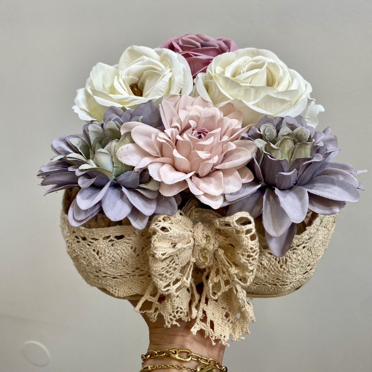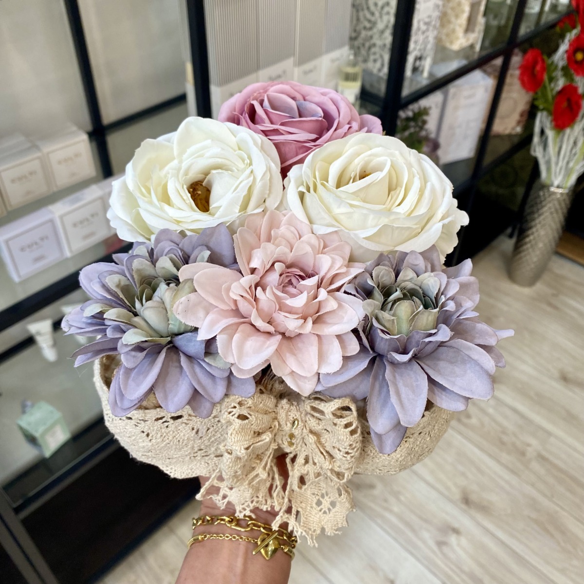 Színes selyemvirágok kerültek ebbe a fából készült, szív alakú dobozba. Bájos csipke szalag teszi még romantikusabbá.